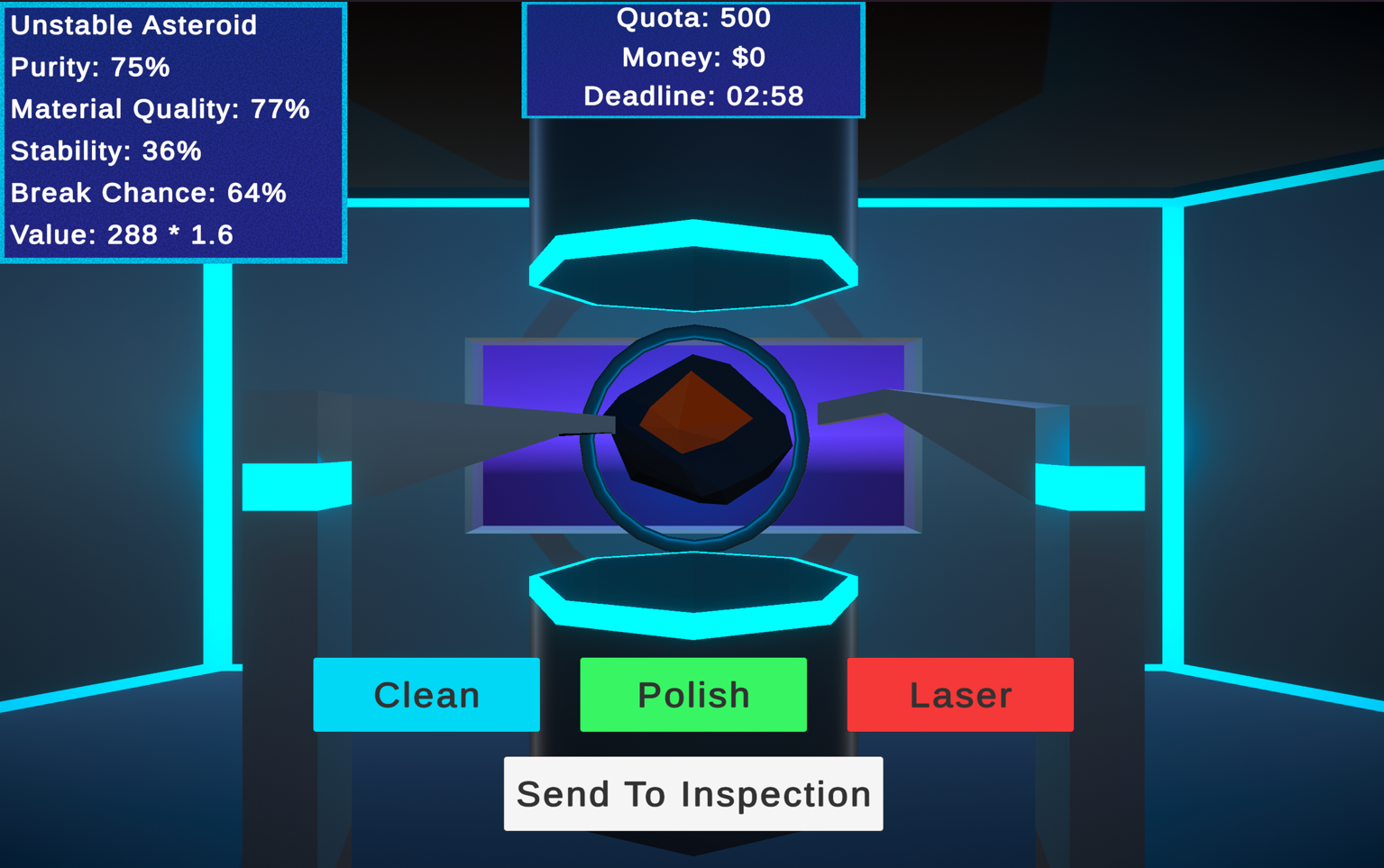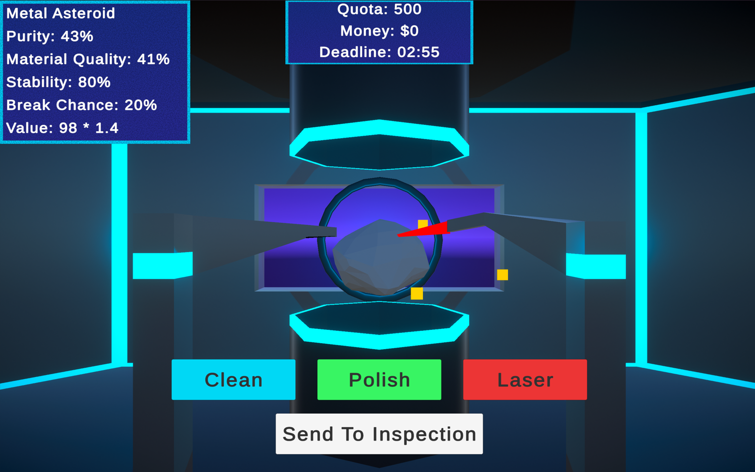 Welcome to Refinery 17! Take on the role of a disposable worker in charge of performing maintenance on incoming Asteroids! Meet the quota by improving the quality of the Asteroids then ship them off to inspection, but be careful if you overdo it your Asteroid may break!